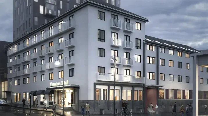 Moderne leilighetskompleks ferdigstilt i 2022, som forvandlet et ikonisk hotell til 54 unike boliger midt i hjertet av Bodø sentrum.