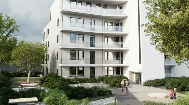 Bærekraftig boligprosjekt med moderne leiligheter, som integrerer grønn teknologi som solcelleanlegg og smarthus-løsninger.